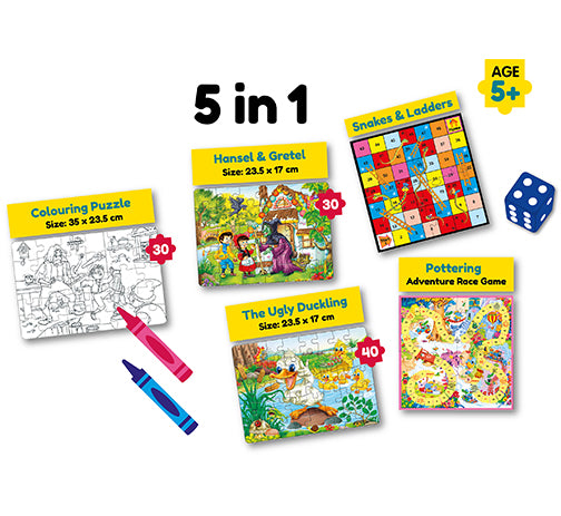 5-in-1 Play Pack for Kids – Jigsaw Puzzles, Coloring Puzzle, Snakes & Ladders & Pottering Board Game Set