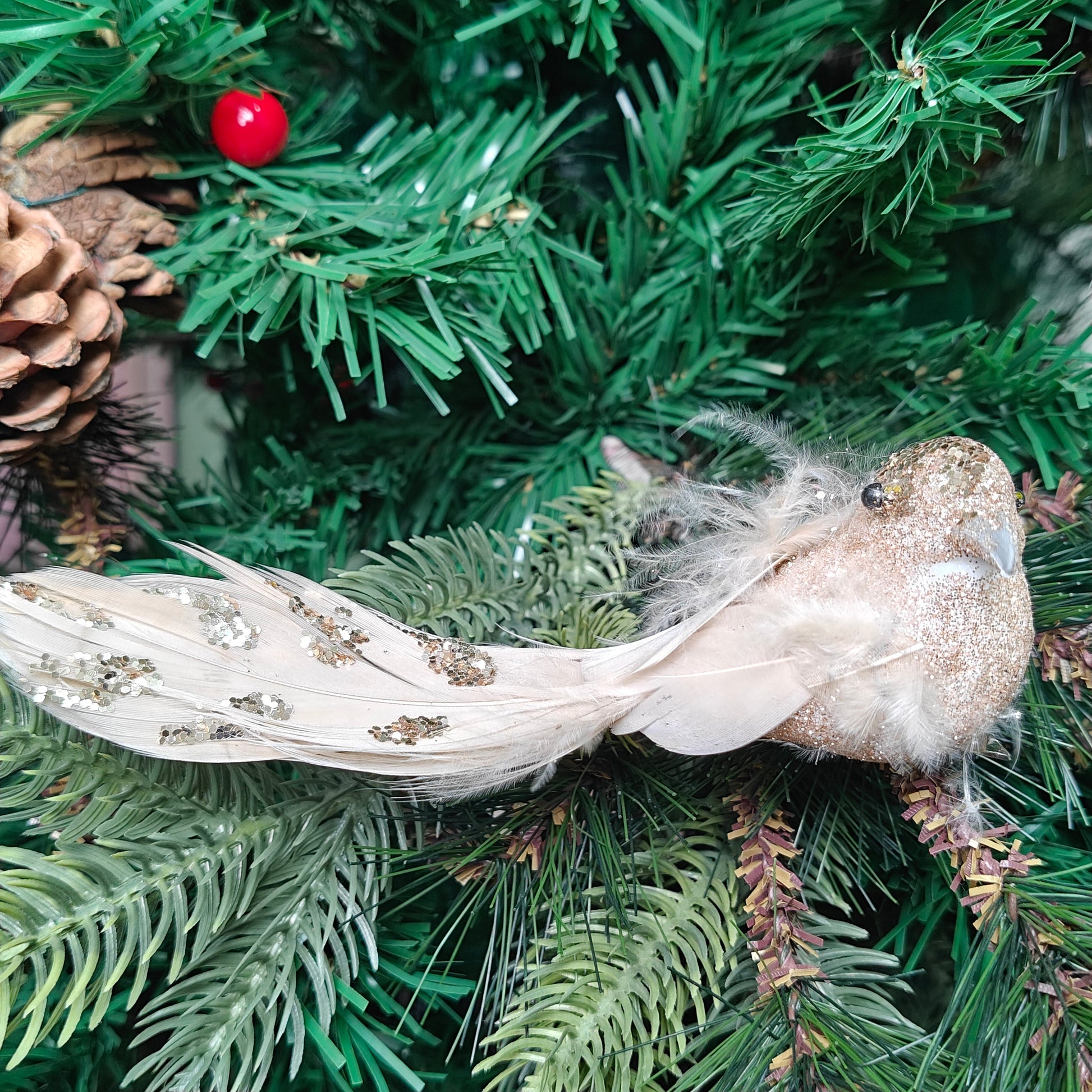 Each bird features a glittery body and soft feathered tail that catches the light beautifully.