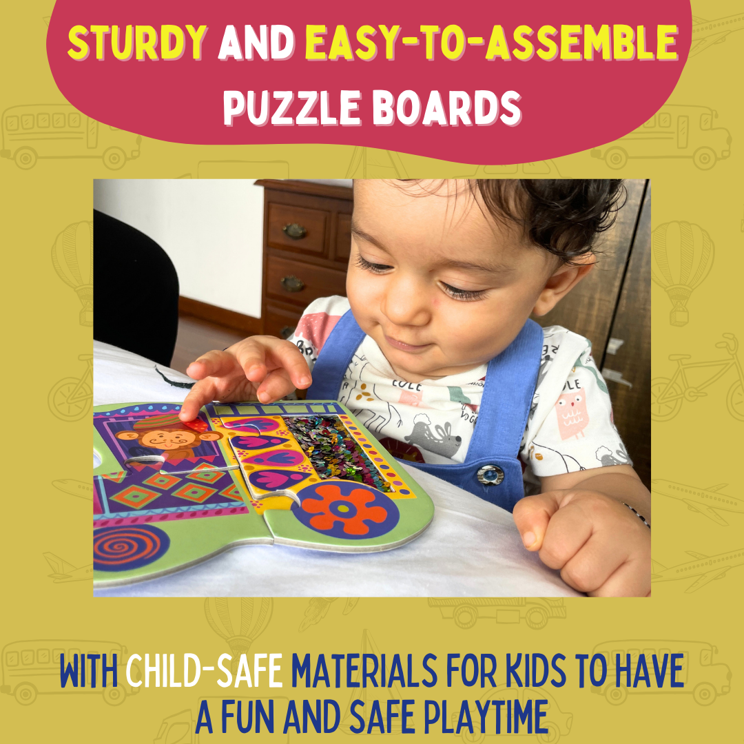 • Sensory Engagement: These puzzles engage your child's senses through touch. Each puzzle piece embodies a distinct vehicle with a whimsical animal driver and a unique texture. For example, the train engine dazzles with sequins, and the sailboat gleams with a smooth, glossy finish. This sensory exploration fosters fine motor skill development.