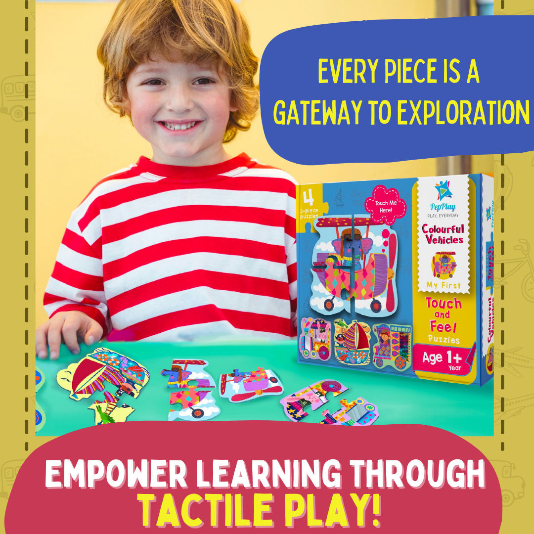 PepPlay’s My First Touch and feel puzzles featuring Colourful Vehicles are a very popular choice for kids. These puzzles combine the tactile experience of touch and feel elements with the engaging theme of vehicles. Children can explore different textures while assembling the puzzle pieces and learning about various modes of Transportation.