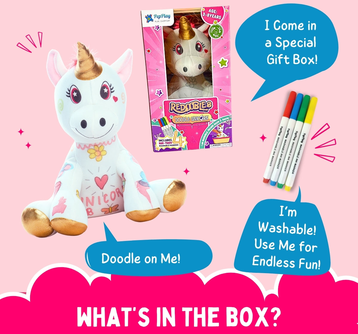 • Eco-Friendly, Reusable Fun: Redoobles – Doodle Unicorn is the perfect eco-conscious toy designed for endless creativity. Featuring a soft, premium plush unicorn with printed doodles, children can color and personalize their unicorn using four vibrant, washable, non-toxic markers.